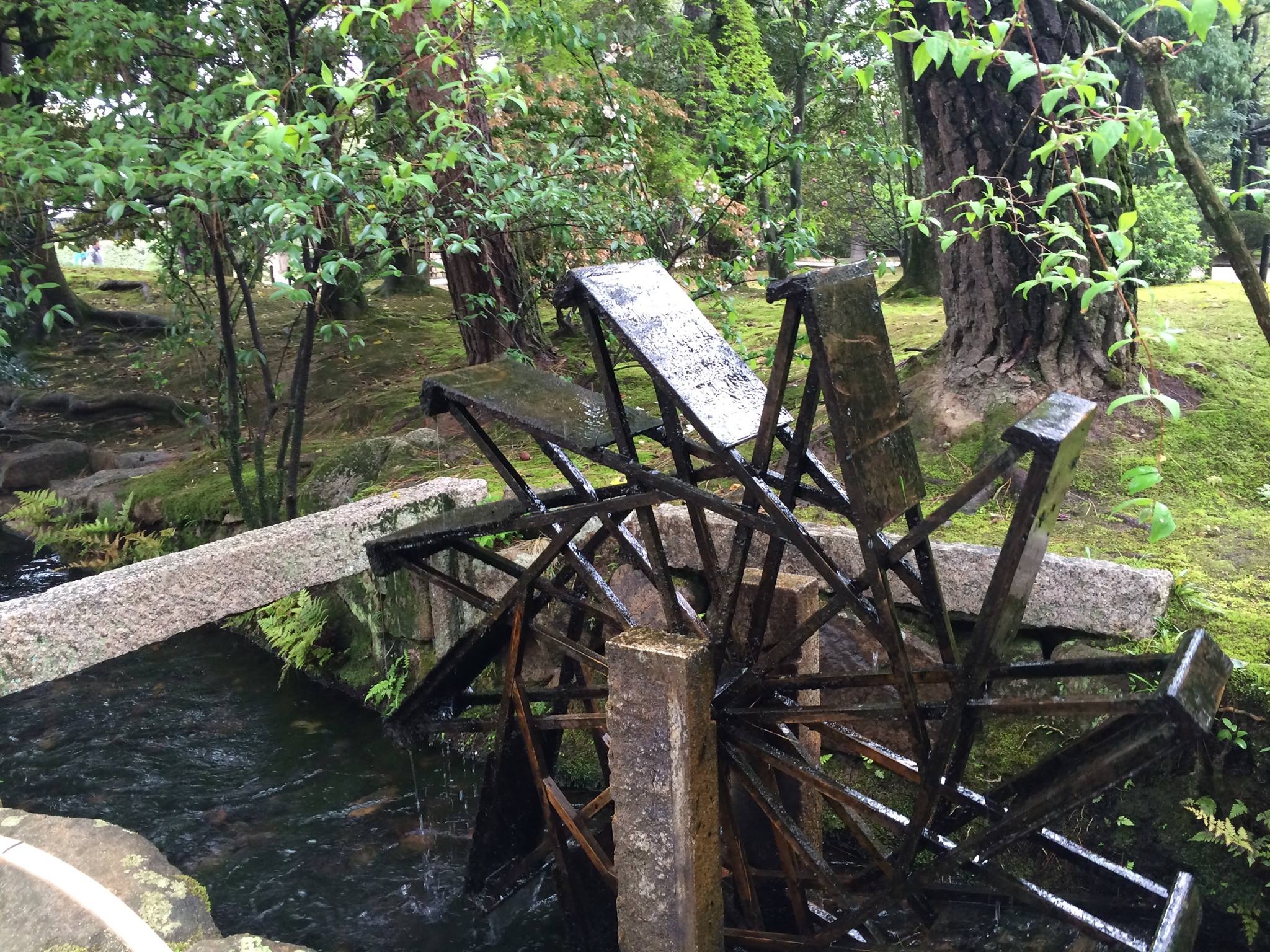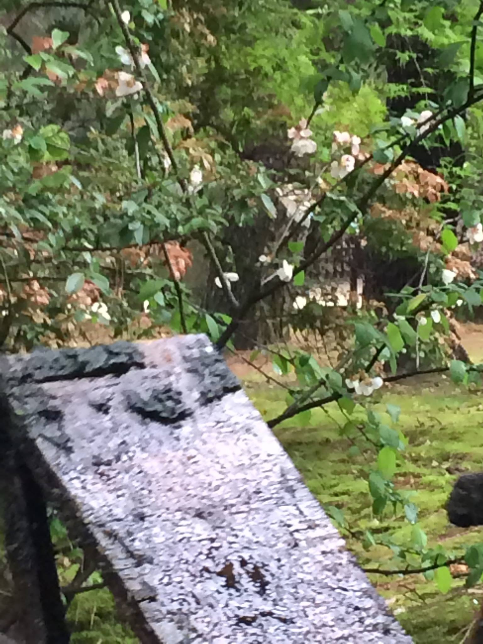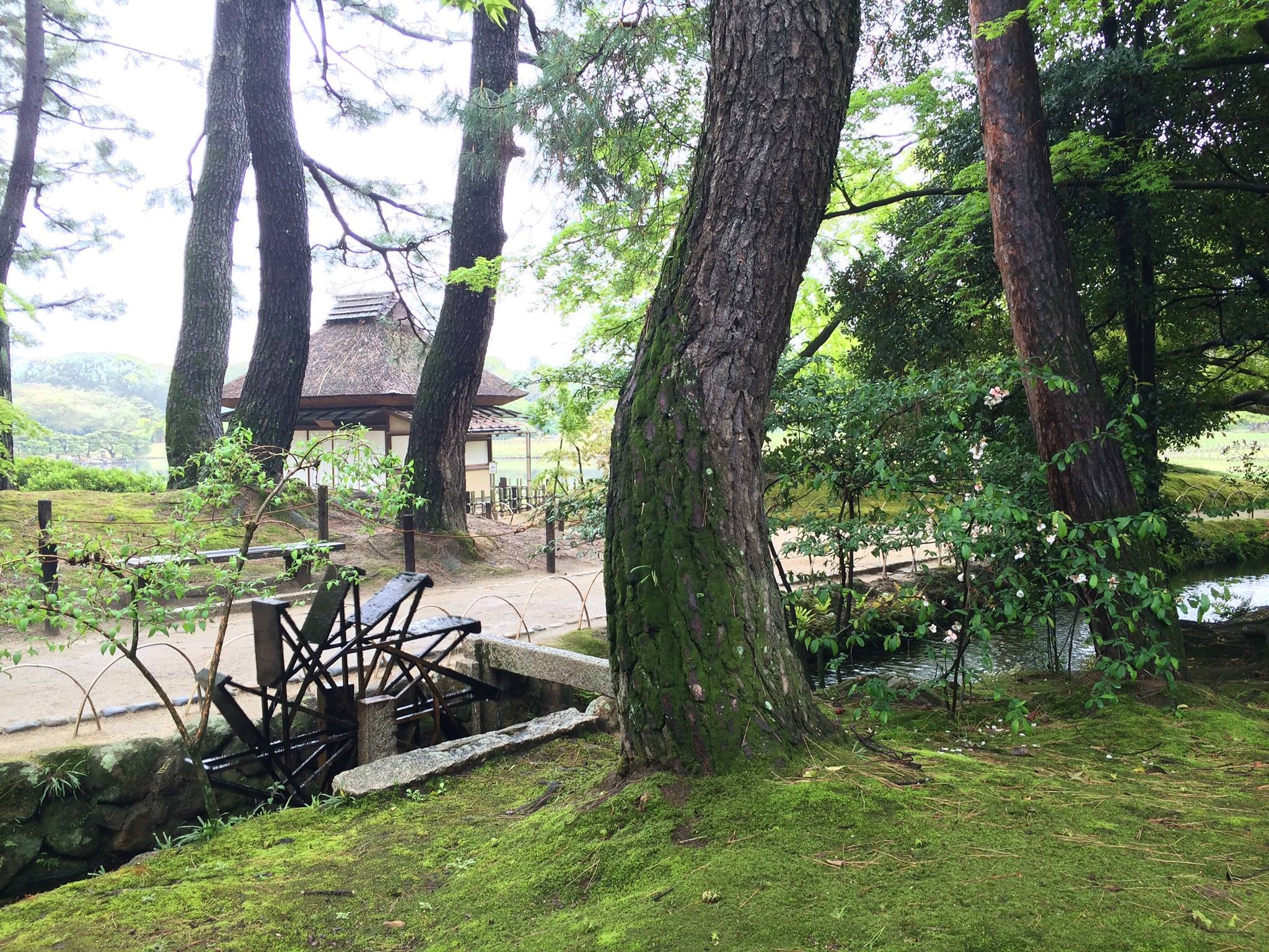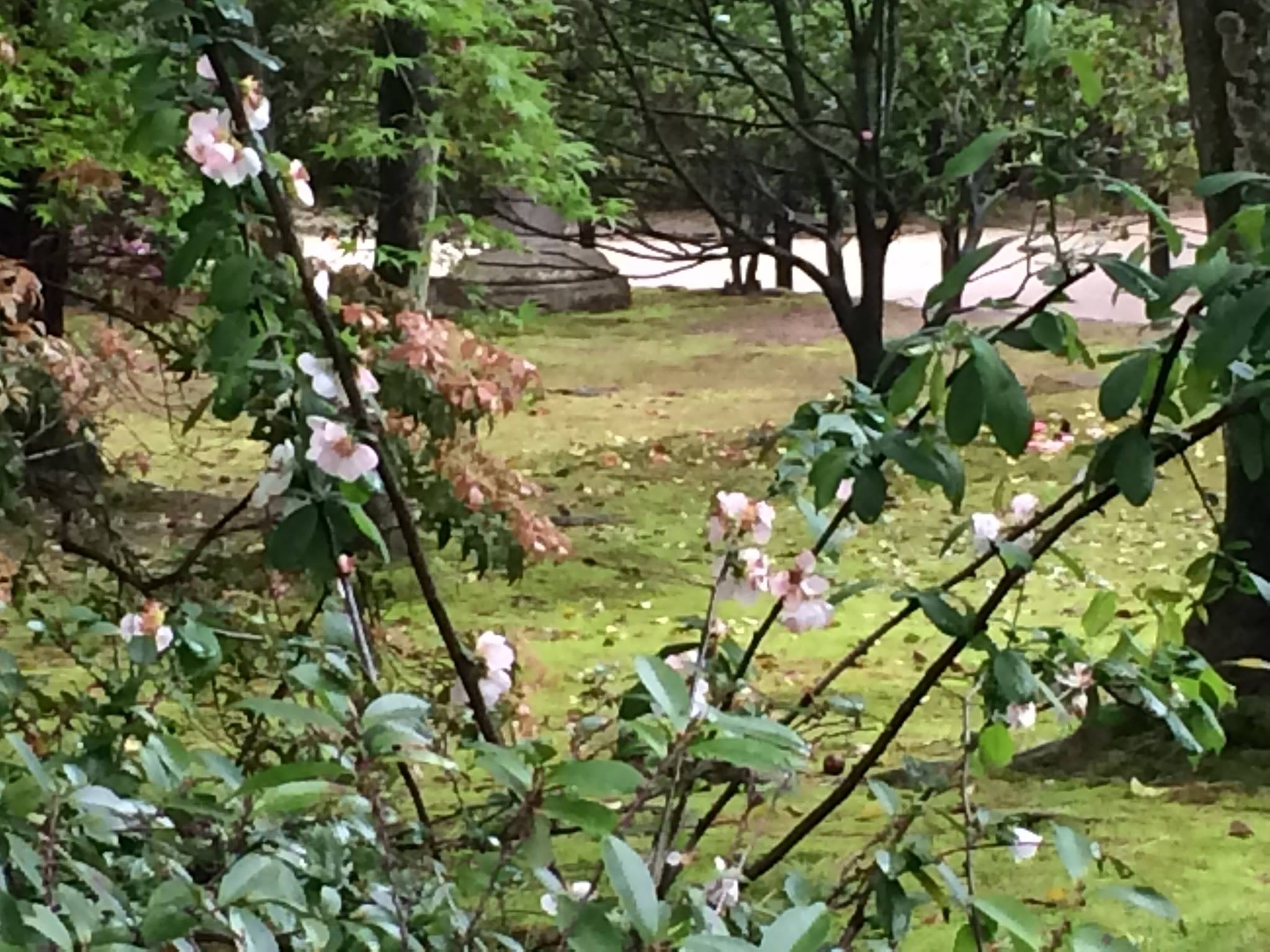 image岡山後楽園広報だよりさんによると、寒翠細響軒北側の水車横に咲いている白い花はボケの花だそうです。