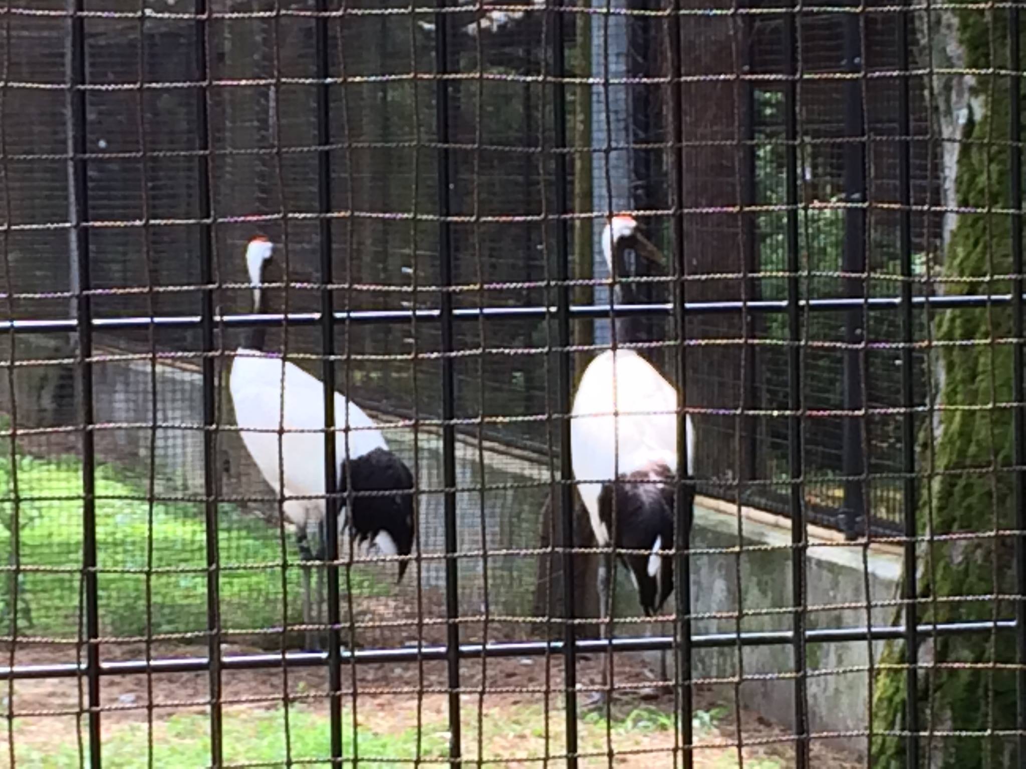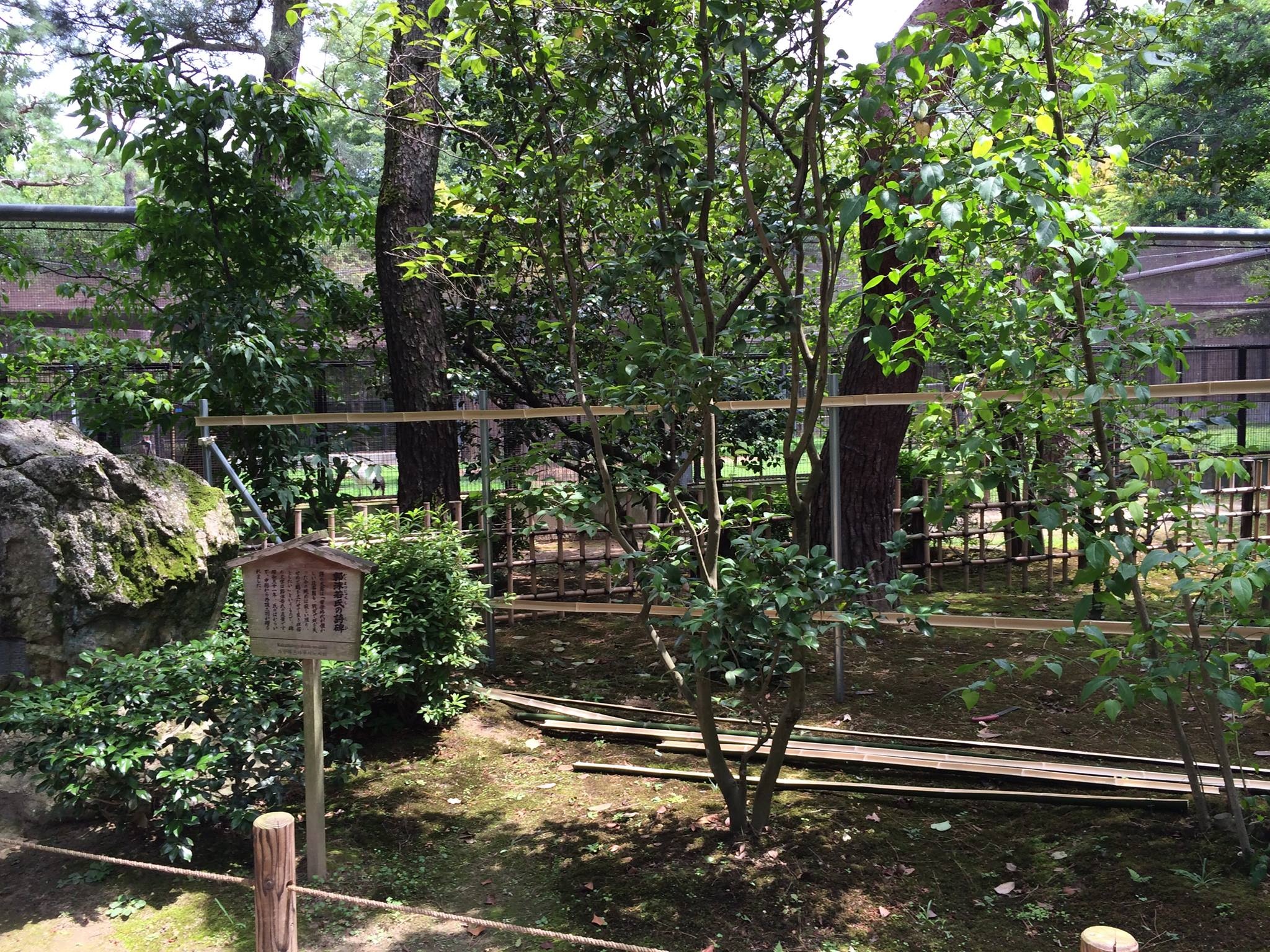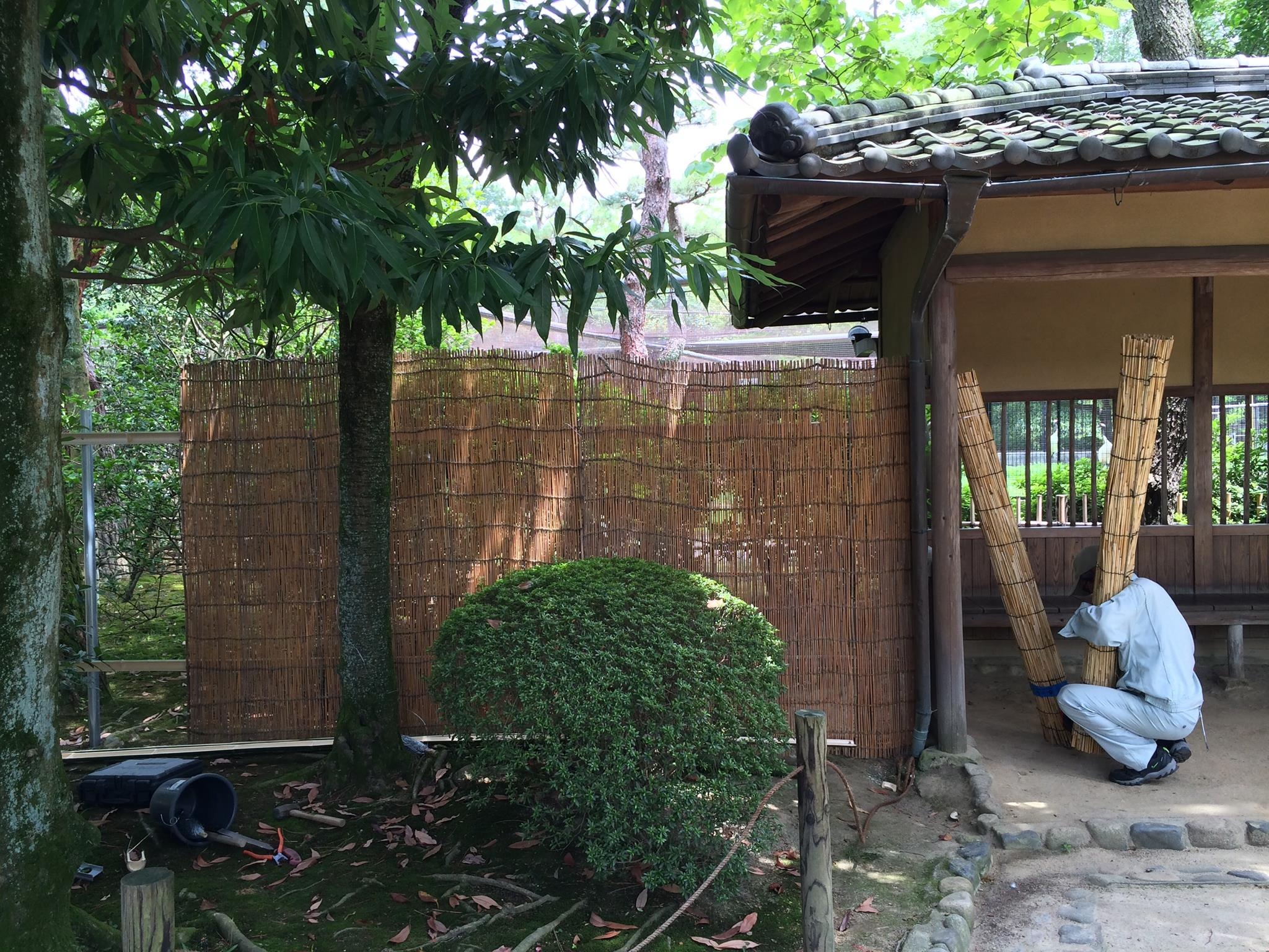 岡山後楽園8月夜間の名物イベント幻想庭園に向けて、タンチョウの安眠?のための目隠しが準備されています。