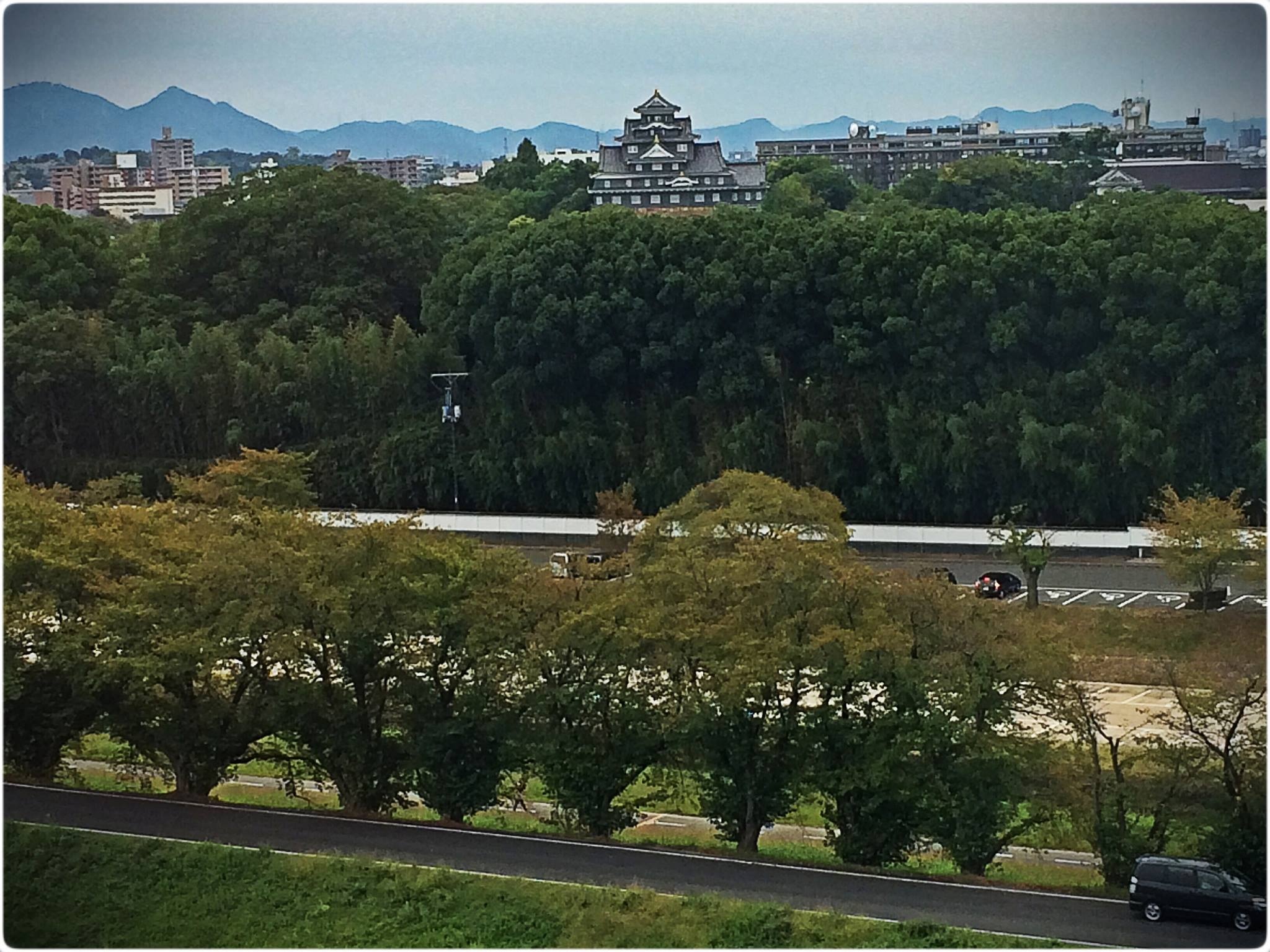 写真は仕事が終わった後に後楽園越しに撮った烏城です。9階からの見晴らしの良さは、流石プラザホテルですネ!