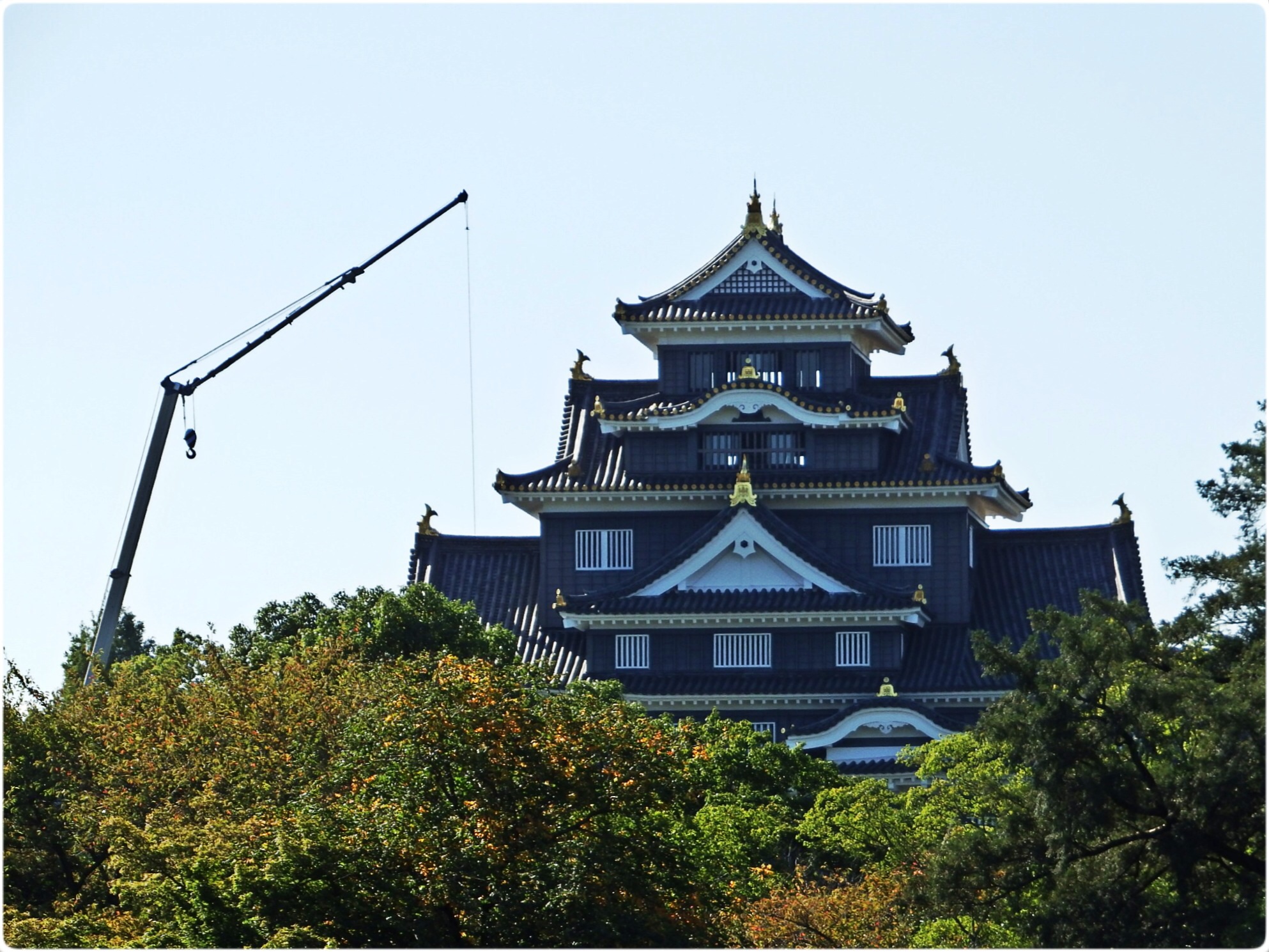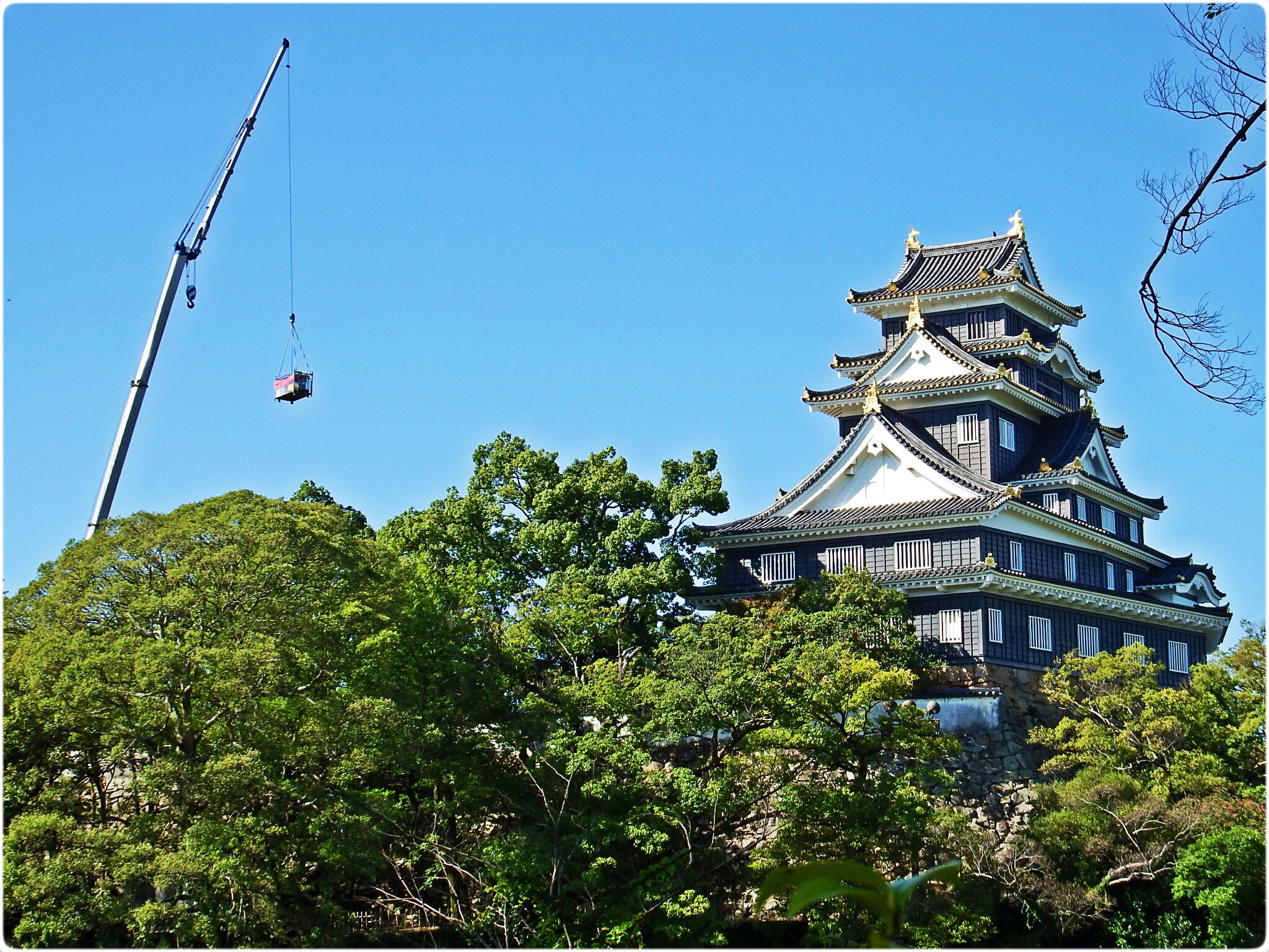 この日岡山後楽園指定写真部の待機場所に着くと、岡山城にクレーンが上がっているのに気付きました。