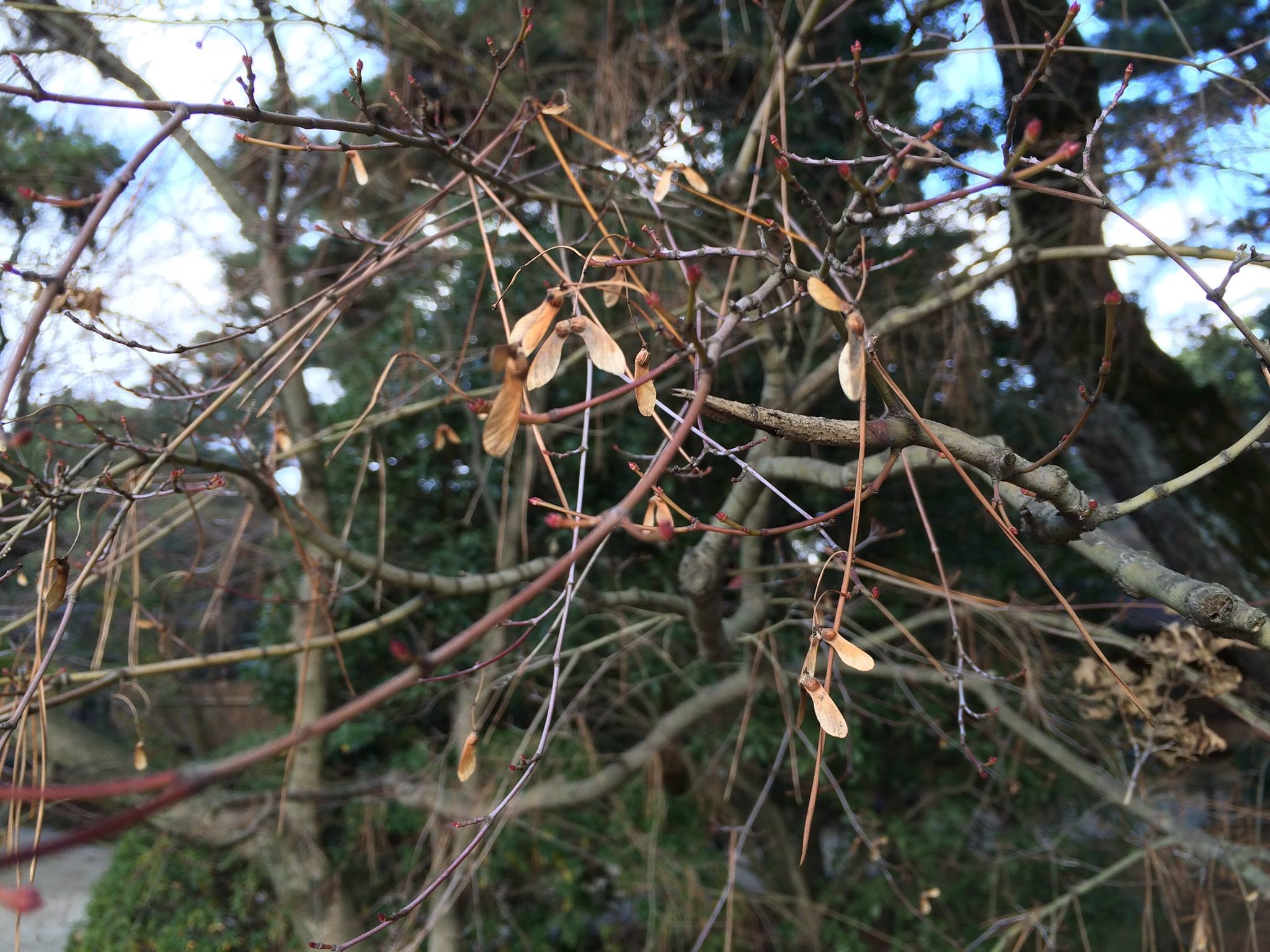 正門入って突き当りの石橋横の赤く紅葉せずに枯れた楓ですが、しっかりと種が出来て新しい芽も育っています。