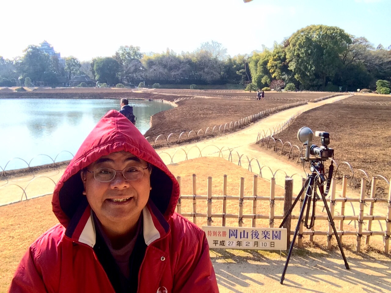 なので今日は覚悟して後楽園にやって来ました。防寒防風用にフードを付けて寒風に備えました。
