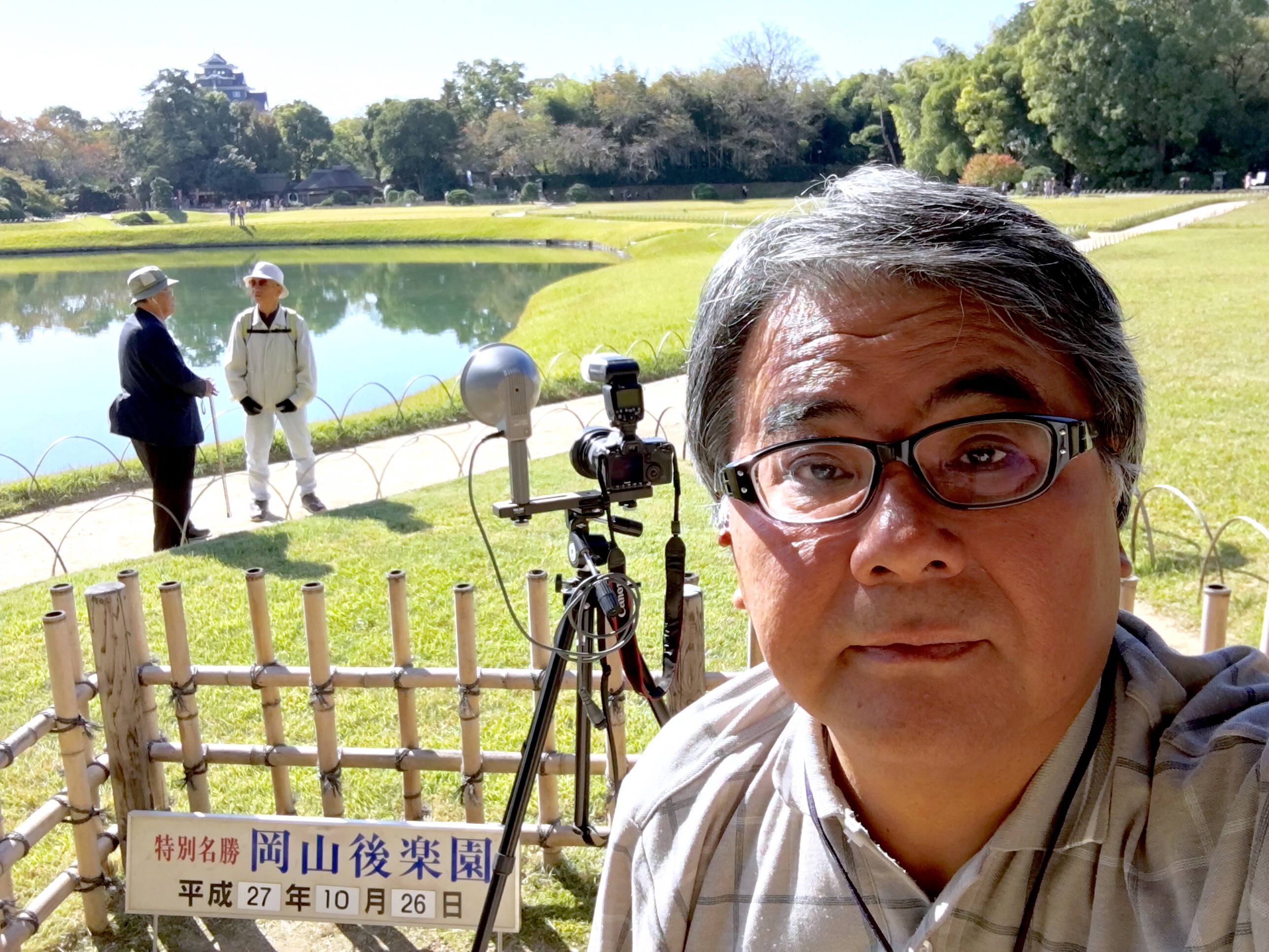 今日の自撮り定点撮影は、後楽園の常連さんお二人が話し込まれているところをバックに撮らせていただきました。
