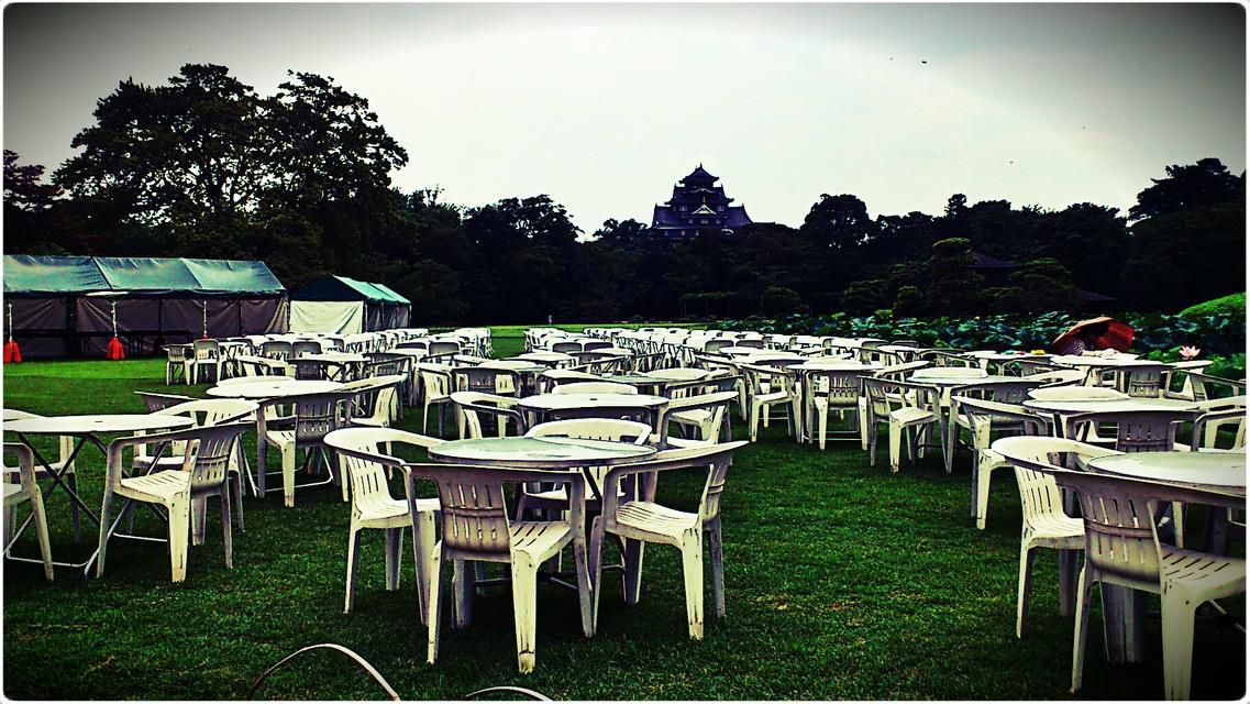 今夜から始まる幻想庭園のビアガーデンに勢揃いしたイスとテーブルです。
