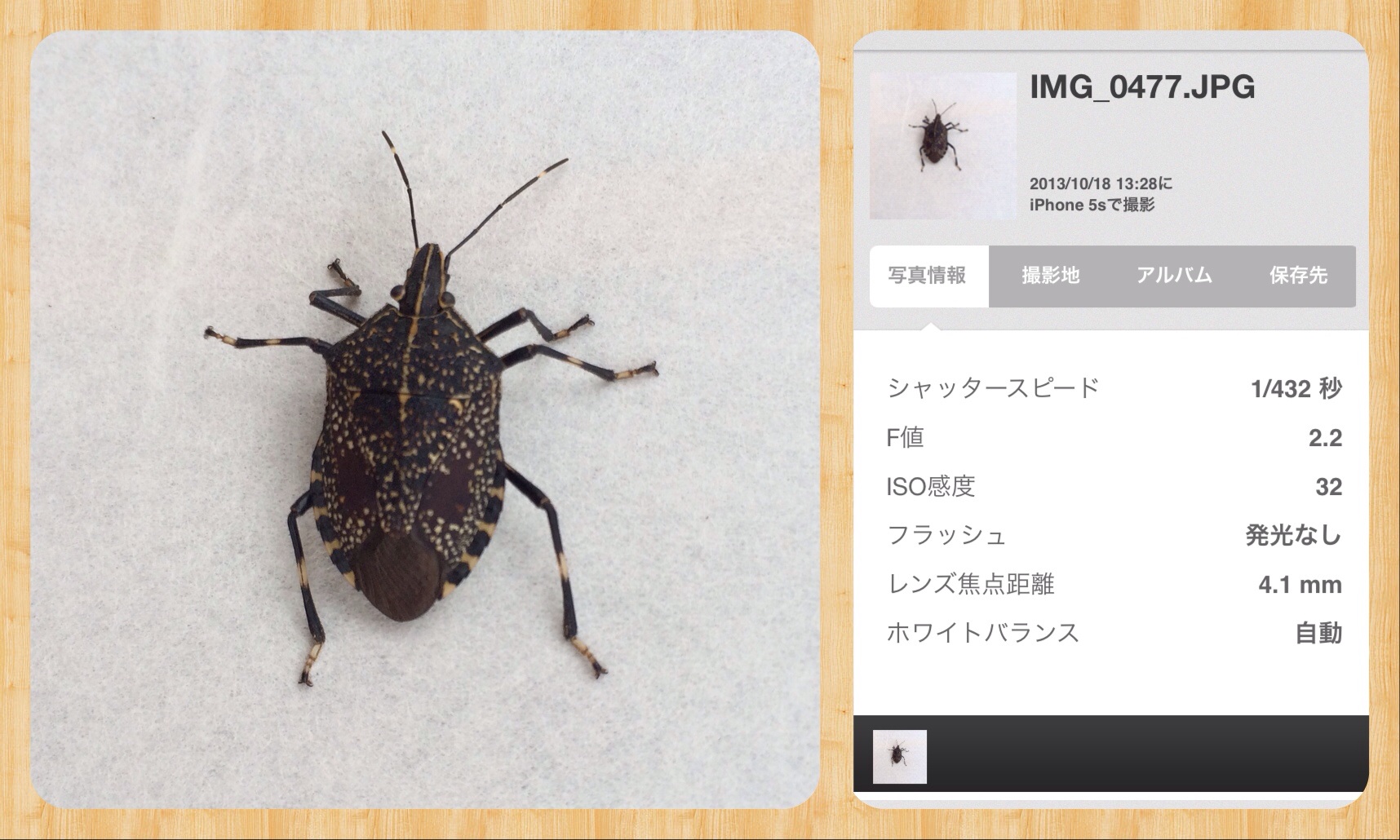 寒翠細響軒の障子にカメムシが飛んで来ました。 右側はiPhone画像のプロパティです。残念なのは画像の縦横サイズが分からないことです。